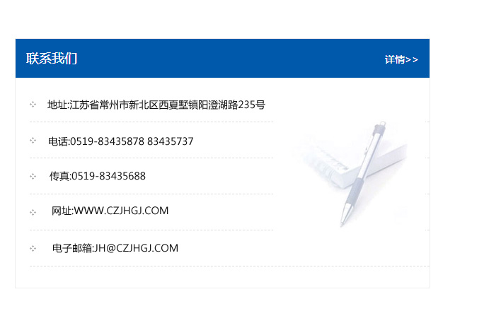 地址:常州市新北區友邦商務大廈1幢16、17層  電話:0519-85101652  傳真:0519-85112595  郵編:213022  網址:www.cz-jiayue_cn.cq029.com  郵箱:xiajifengaa@163.com